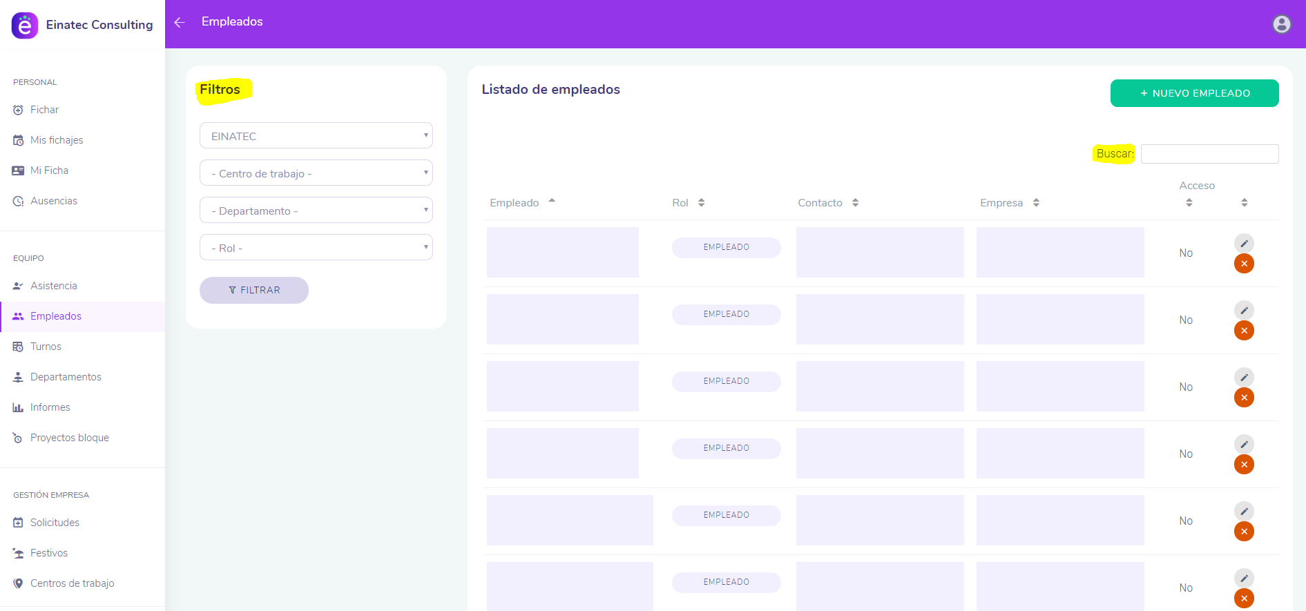 Para editar el tipo de una solicitud, en la barra lateral izquierda y dentro de las funciones de Equipo, tenemos que hacer clic en Empleados. Nos aparecerá la lista de todos los empleados, así que en caso necesario podemos utilizar un Filtro o buscar a un empleado en el buscador.