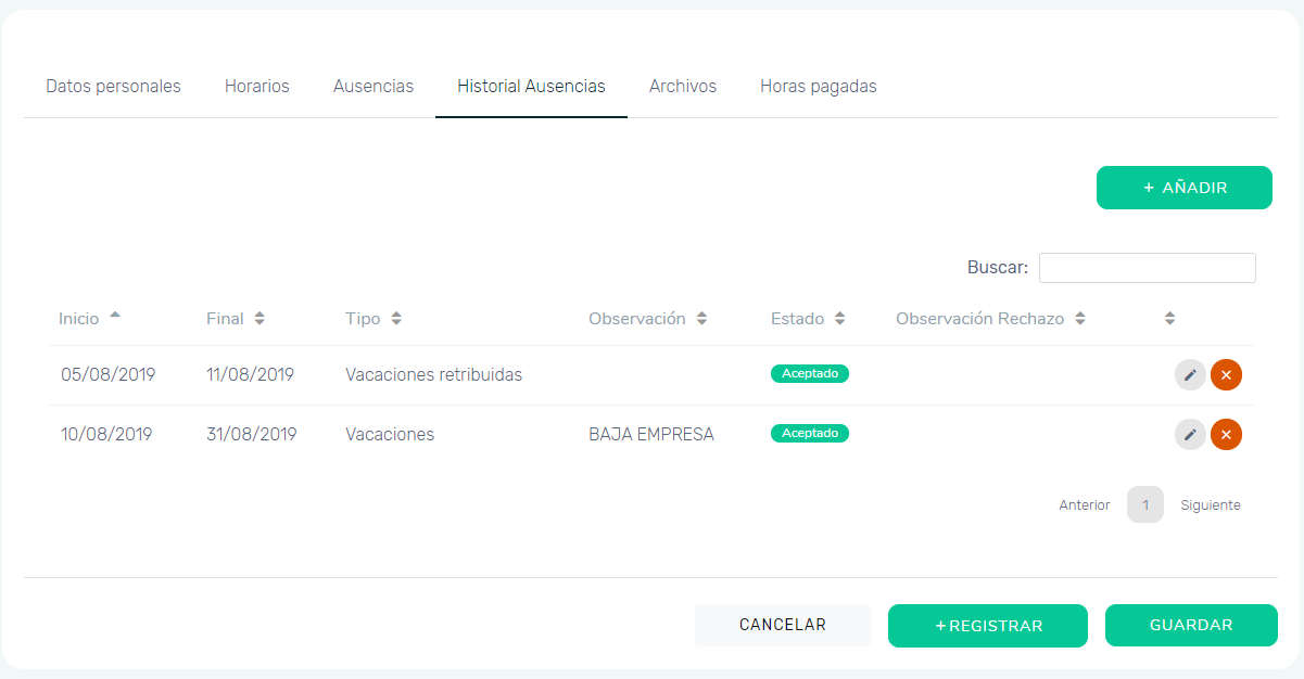 Después, necesitamos apretar en el icono del Lápiz al final de los datos del trabajador. Se abrirá la ficha del empleado, donde necesitamos pulsar en la opción de Historial de Audiencias, para poder encontrar la ausencia que queremos editar.
