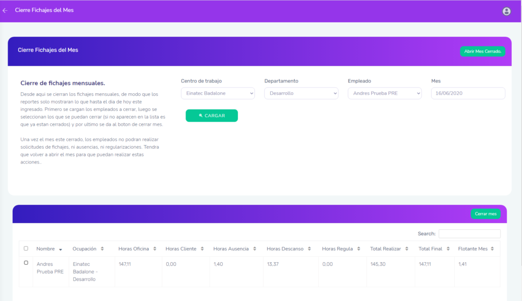 Una vez un mes de un empleado este cerrado, este ya no aparecerá en la lista para cierres del mes, sino que solo aparecerá si clicamos en “Abrir mes cerrado”, para poder realizar la apertura de dicho mes cerrado.