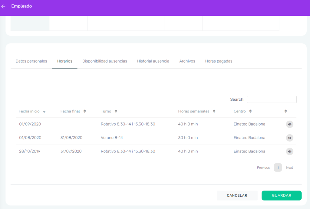 Podemos visualizar el Horario y el Centro de Trabajo en la Ficha del empleado: