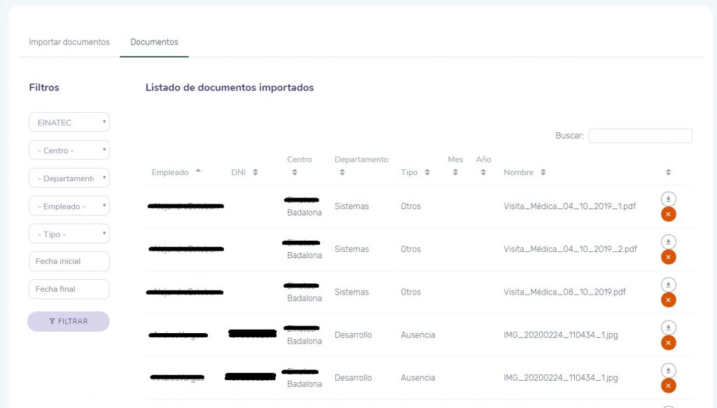 El rol gerente y multiempresa, puede ver las de cada empleado. En el mismo apartado de Documentación (punto 1 de la imagen anterior), tenemos que seleccionar la pestaña Documentos, en vez de Importar Documentos. Podemos buscar por DNI o filtrar los resultados.