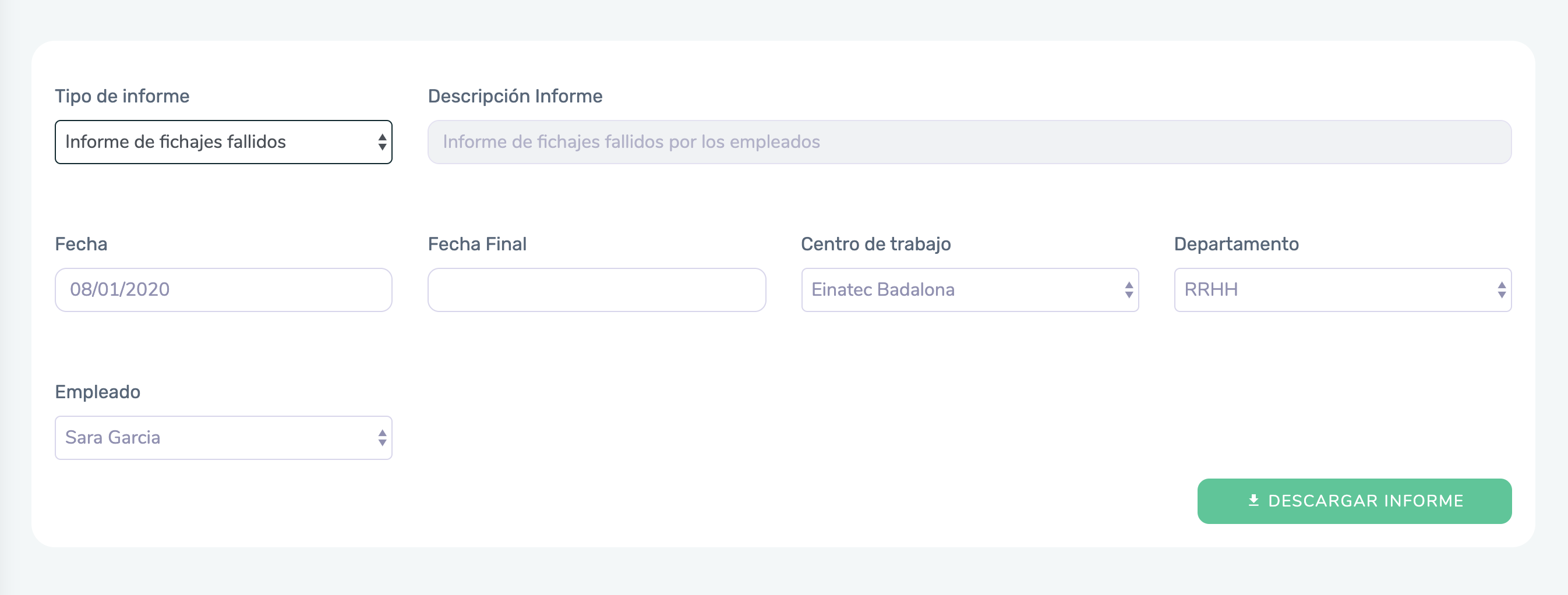 Si pulsamos en Descargar informe, obtendremos el informe donde podremos ver entre qué días se ha producido el error. También podemos descargarnos este informe en el apartado Informes, seleccionando en Tipo de informe el ‘Informe de fichajes fallidos’.