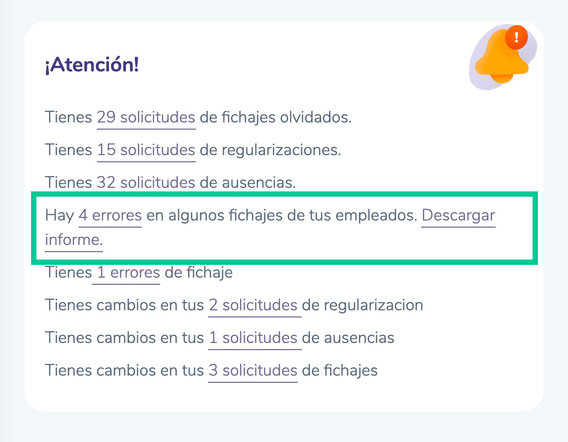 Aparecerá el mensaje: ”Hay X errores en algunos fichajes de tus empleados. Descargar informe.“
