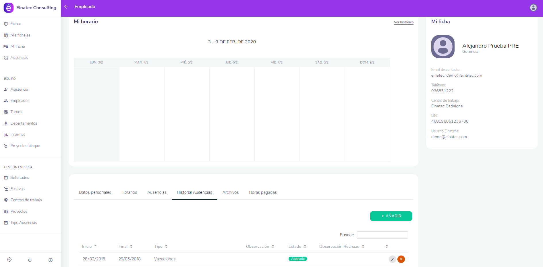 Si tenemos el rol de Gerente, podemos ver el historial de ausencias de otros trabajadores. Y como empleado, podemos ver nuestro propio historial de ausencias.
